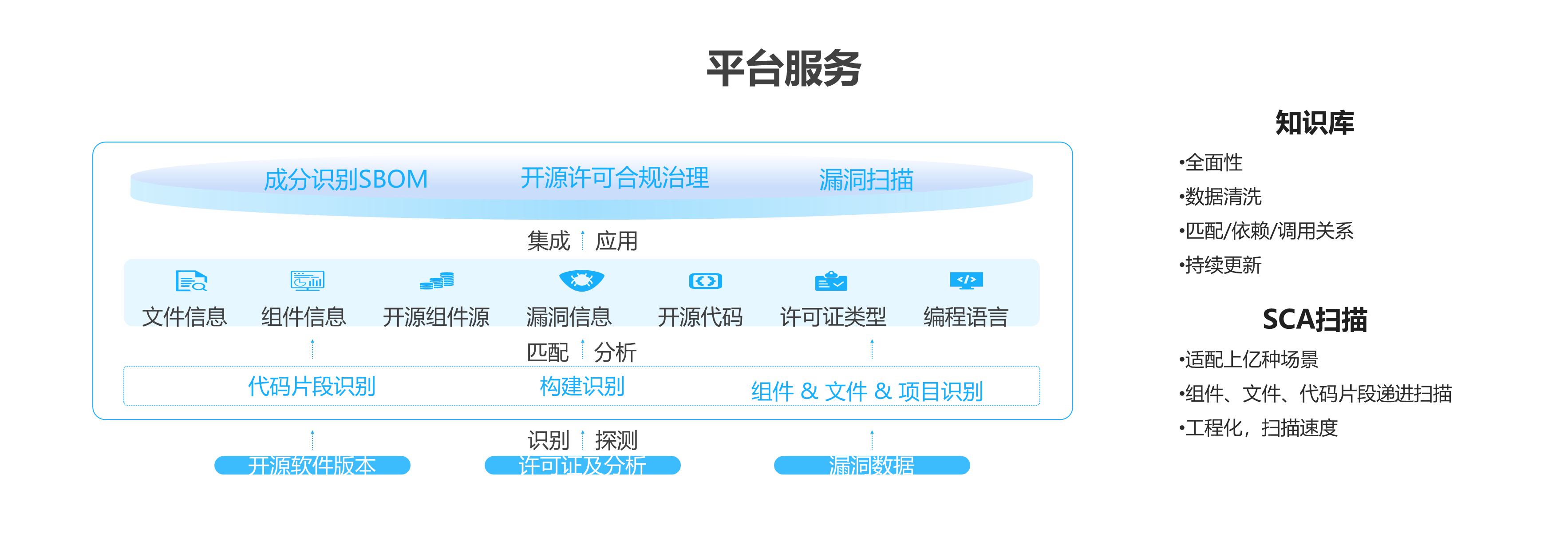 二进制文件成分检测 ● 文件特征、字符特征、符号特征、结构特征组合灰度识别 ● 配置文件解析、Metainfo解析联合 ● 支持各种二进制文件类型:压缩归档文件、打包文件、ELF、PE、APK、固件、容器镜像 ● 支持多种编译中提取二进制特征 | ||